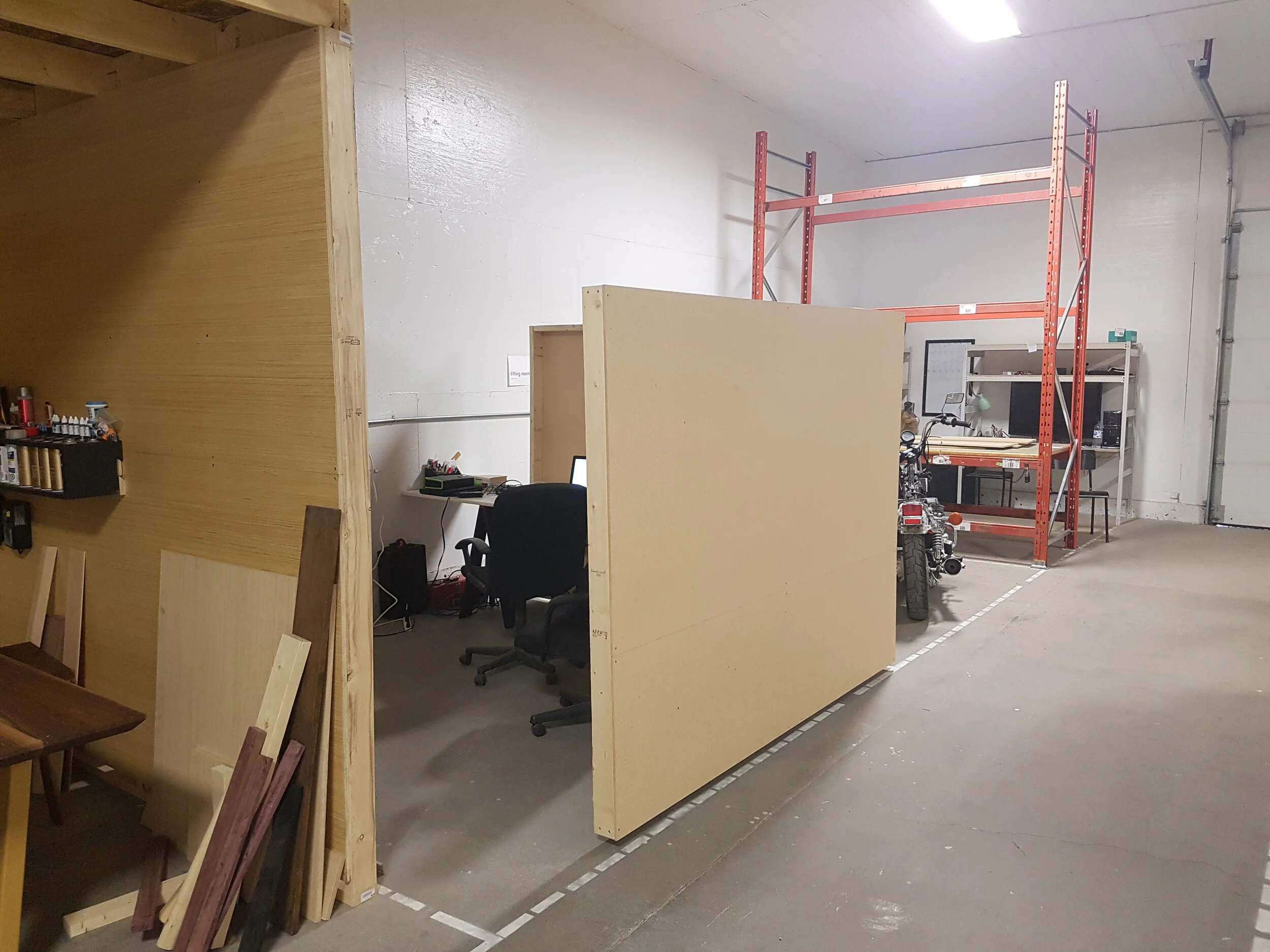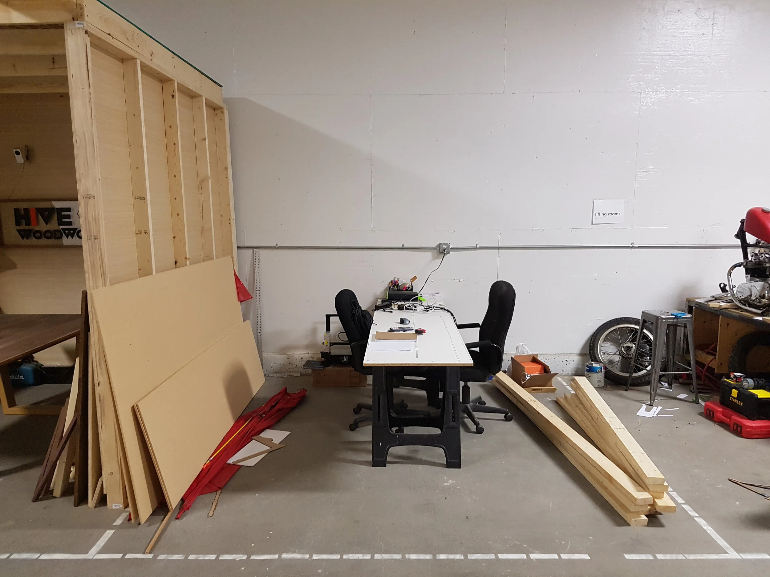 One of my first tasks at Kinetic was setting up the office. We had a 10’ x 10’ plot at the Saskatoon Makerspace to work out of. Conveniently, a Habitat for Humanity ReStore was just up the street from the Makerspace where I was able to frugally source construction materials.